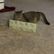 Brown tabby with black stripes. Her left ear is clipped from when she was feral. She has short stubby legs and tail.