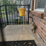 Small, grey and black striped cat found. Has black at the end of its tail. Cries loud at the door and tries hard to come inside.