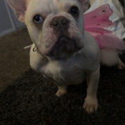 White Frenchie with 1 blue one and 1 black eye