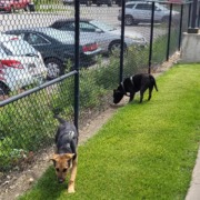 2 buddies running and playing together. Black Pitt & German Shepard puppy. Very nice. Seen at 2045 E. Washington St. hunting a groundhog. Both have green harnesses.