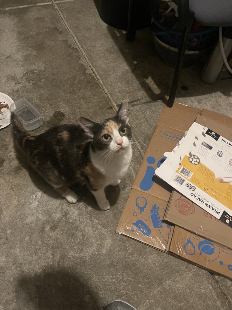 Short hair calico with some white. Stub tail. Very friendly and approachable. Proof of ownership required.