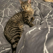 He’s a kitten only 7 months old. Gray with very distinct black stripes. Very thin but long. Whiskers are short and almost curly. He is the runt and scared of everything.