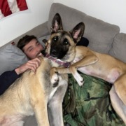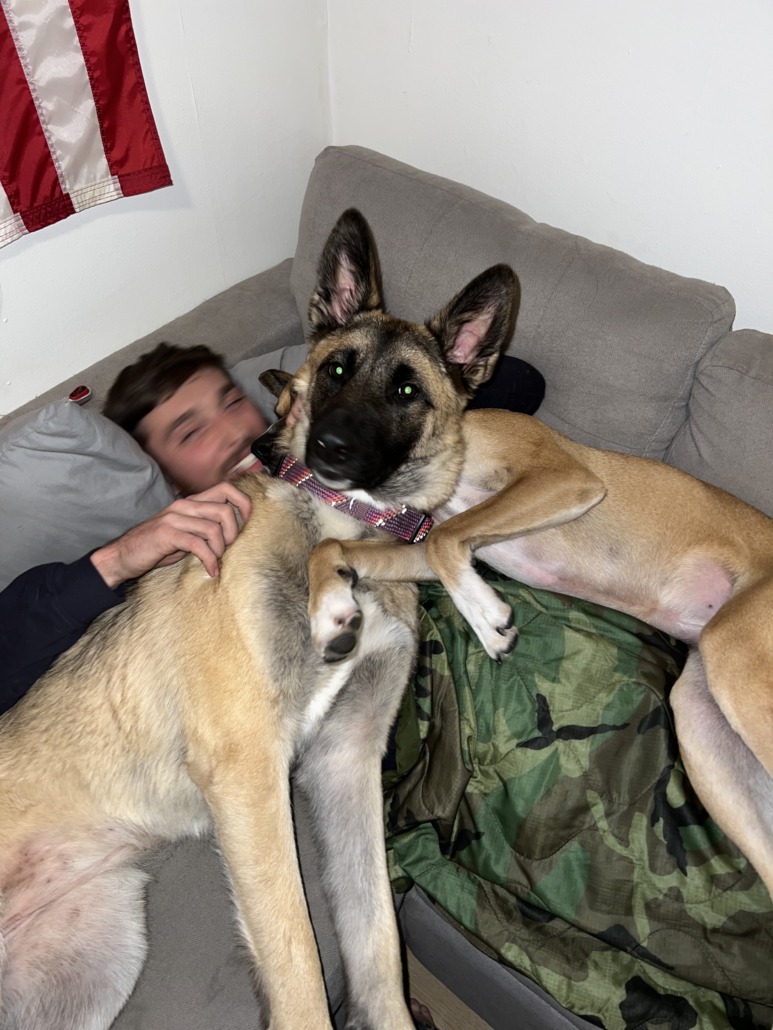 German Shepard/Akita mix. Brown and black with a white stomach.