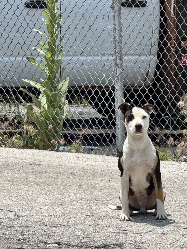 Tru-color pit bull puppy. Has a hurt back leg but runs around just fine. Friendly