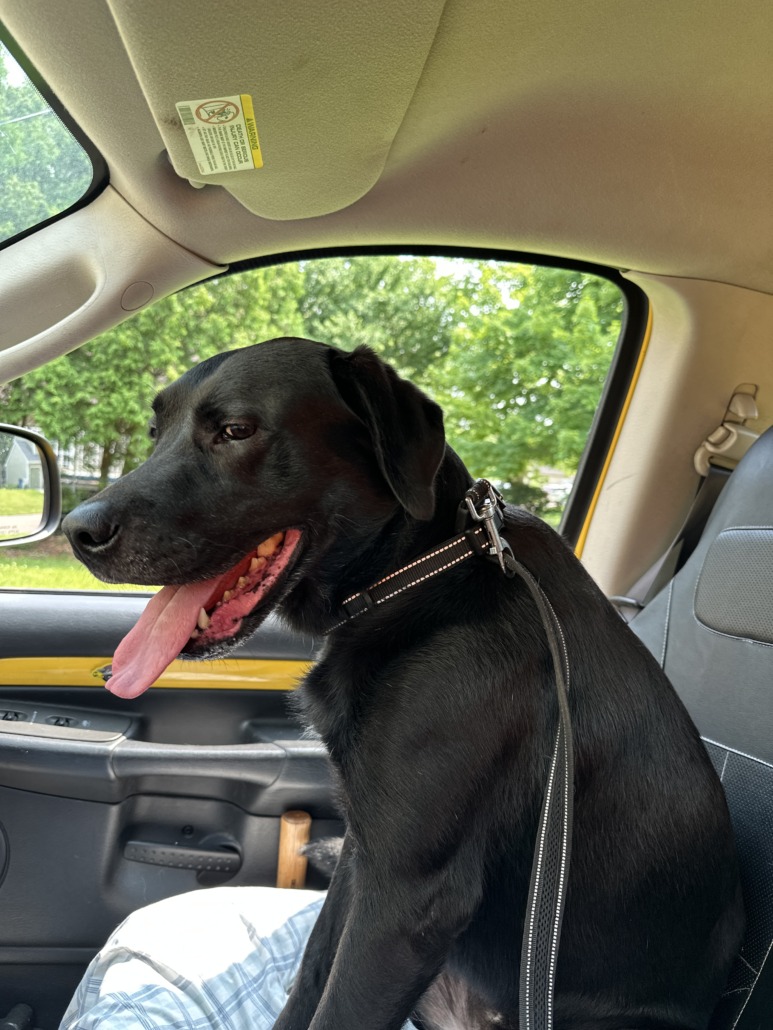Black lab with white mark on his chest and tips of paws. Has a shock collar on with no ID. Very calm.