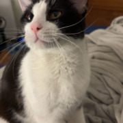 Black and white male. Very friendly! Will likely approach if offered food.
