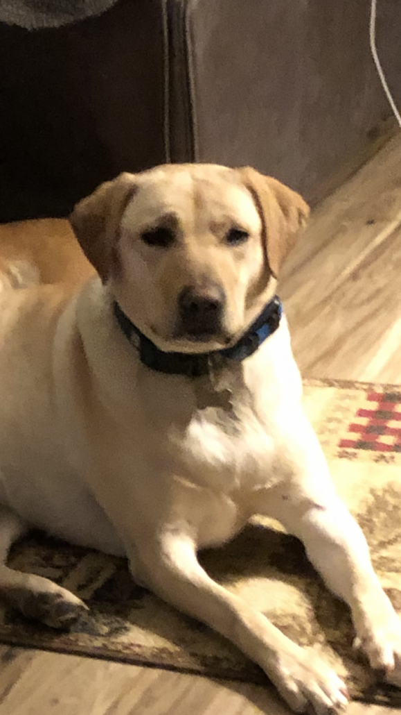 Female yellow lab with microchip and has on a Michigan state collar. She has a tattoo by her belly bottom