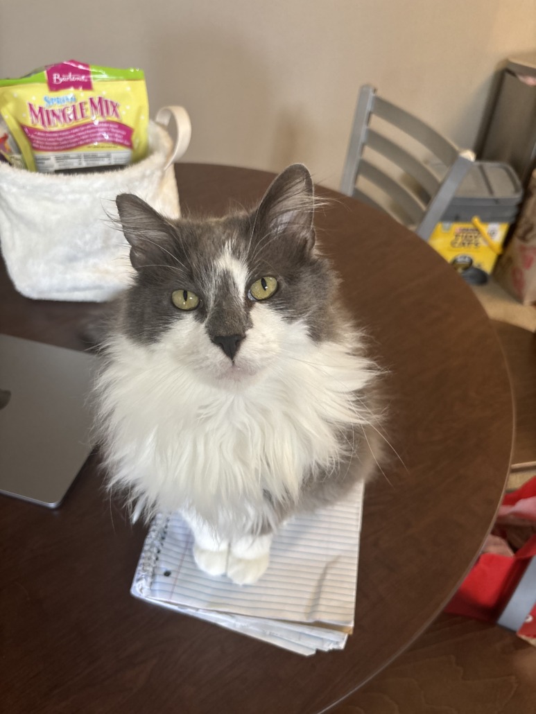 Grey and white fluffy super friendly