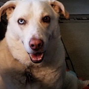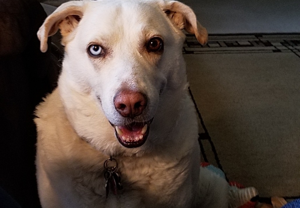 Bear is a husky, lab mix with one brown eye and one blue eye. He is overweight but fast. He is very friendly. He has a red collar but he knows how to get out of it. We are from Michigan visiting Indiana.