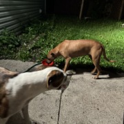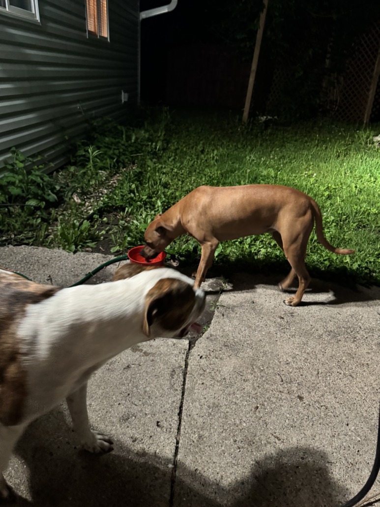 Brindle and white dog and brown dog found in Imperial Hills