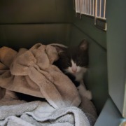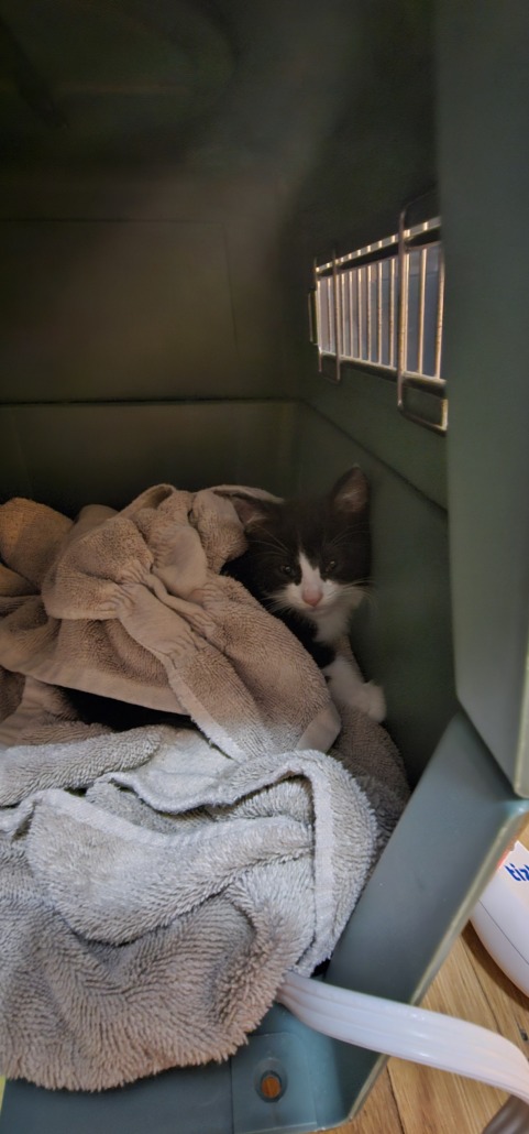 Found very small kitten in distress outside in a bush on Emerson and Julian (close to washington.) Found Sunday night 5/15 late around 11:30/midnight. Mostly black with white face and belly. It is very sweet and mild demeanor. We think it is a girl.