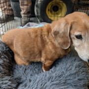 Red standard Dachshund showed up at my office at 971 W. U.S. 40, Greenfield across from Prairie Meadows apartments. She has a pink collar with no tags.