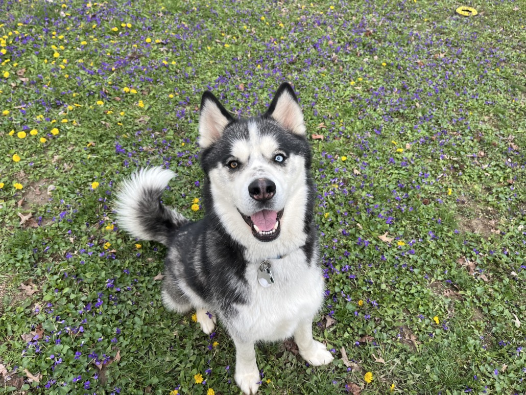 Answers to Myshie; very friendly, very active and loves to run, heterochromatic eyes, no collar, male, 4 years old