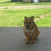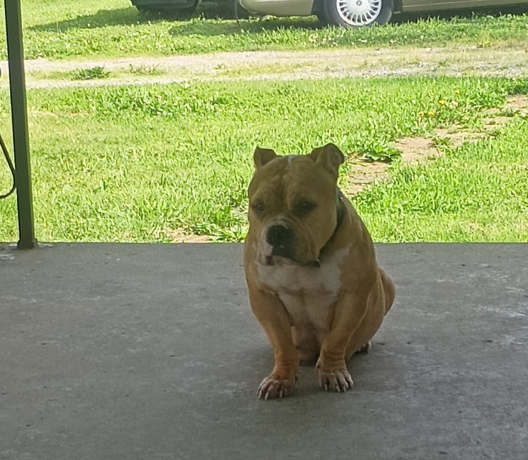 A Bown pocket bully I believe. She has white patches on here as well. Proof of ownership is required, thanks.