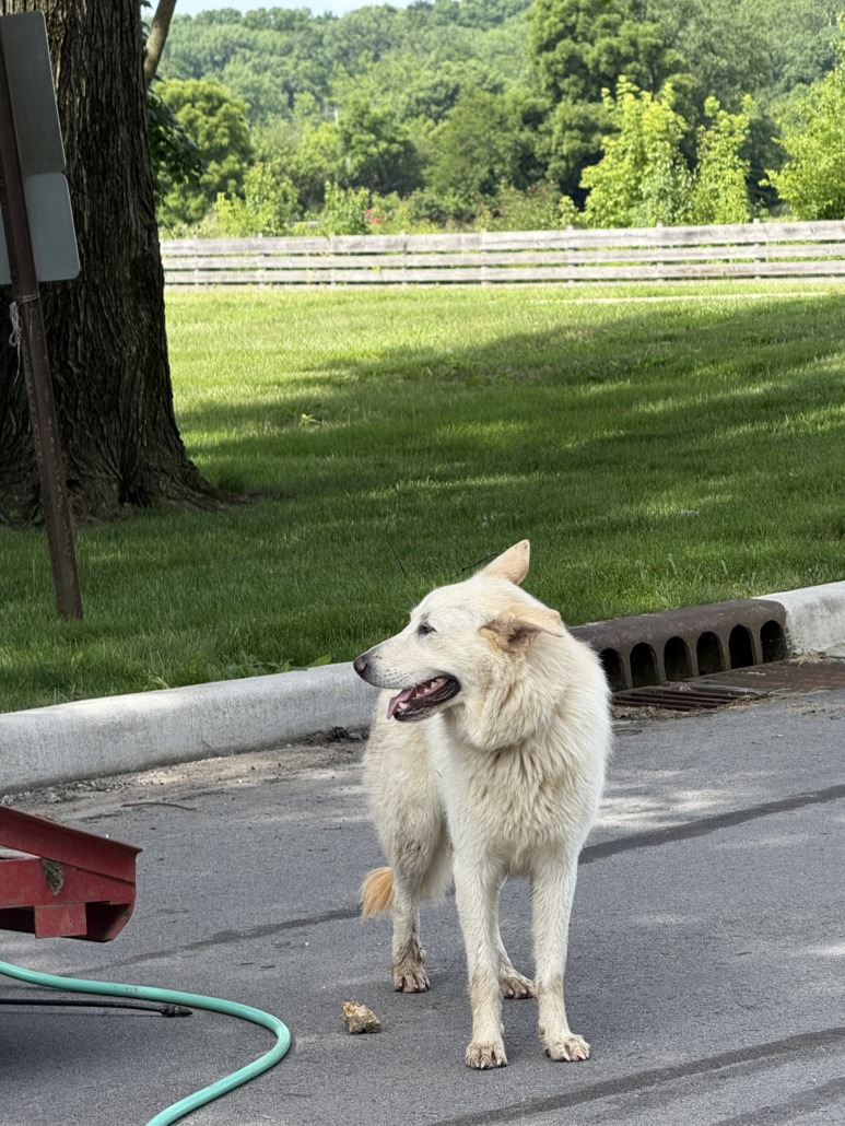 Sweet dog but skidding so I couldn’t check the tag if there was one. I left food out so they would stay away from the road