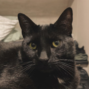 Binx is a black cat but have white spot on stomach and small white spot on front of it neck. He’s friendly and very curious. he’s one of our emotional support 🙁