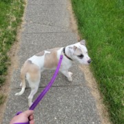 Sonia is only a year and a half. She’s very playful and friendly, but very strong. She gravitates to other dogs and is wearing a collar that’s sort of torn up with sunflowers on it. She is a foster through Indianapolis animal control. She escaped from my backyard.