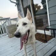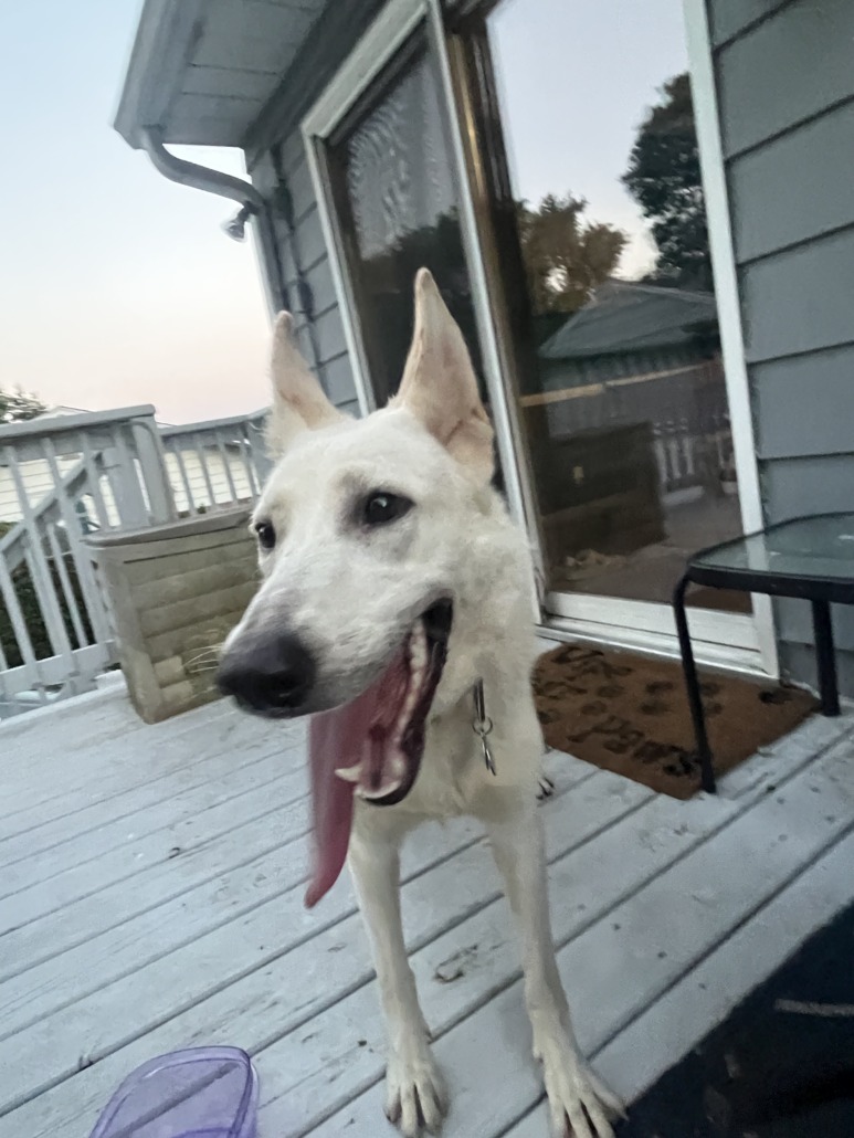 White/Blonde dog found with pink collar. Tags say name is Scout, phone number does not work.
