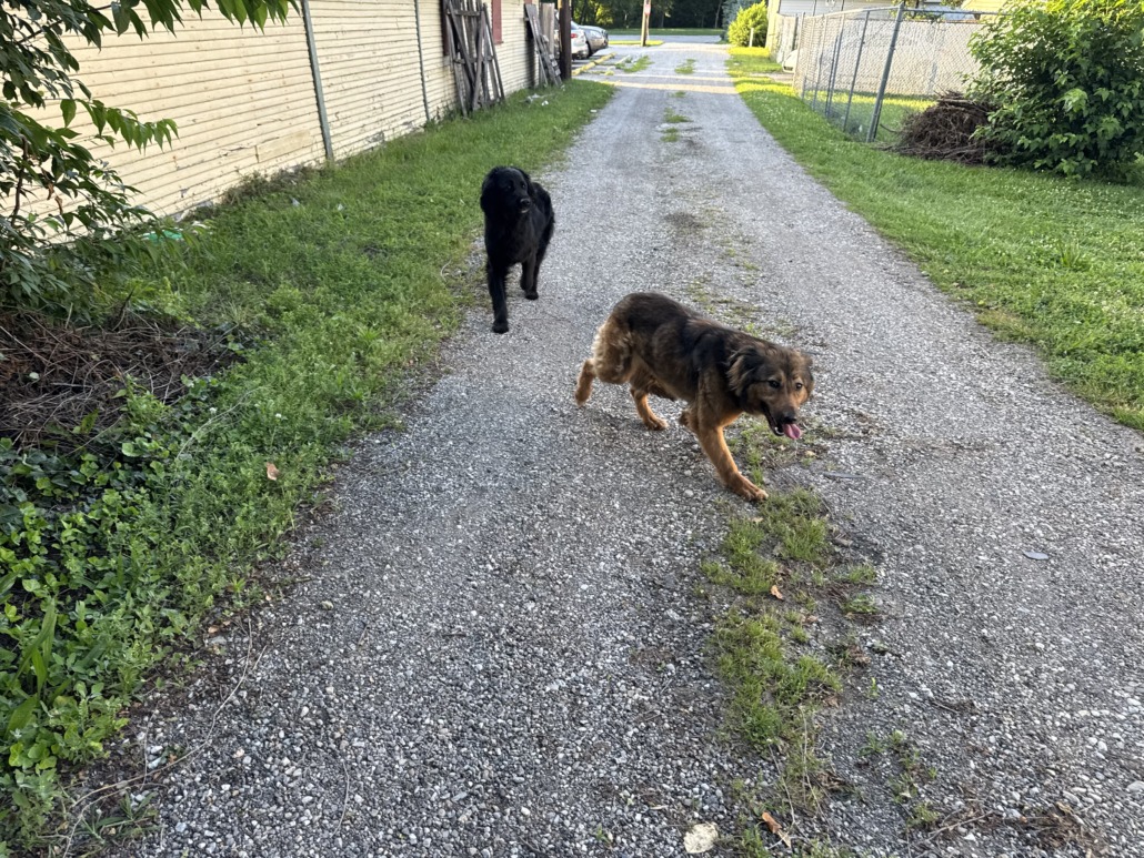 Pair of dogs running around the alley by Barringer’s Tavern