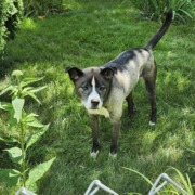 Grey and black dog found. Looks recently shaved. Neutered. Could be some sort of husky mix. Has blue eyes. Not in our possession. Is hanging out around a neighborhood. Proof of ownership.