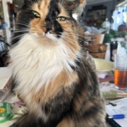 Small, Long hair calico. Four white paws and white mane. Skittish around strangers but will answer to Clara. She has claws.