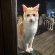 Orange and yellow male. Large boy. Currently underweight. VERY friendly and affectionate. Loves wet food. I first saw him about a month and a half ago. He would come to my back deck, where I feed some feral cats that patrol my neighborhood, but the last few days, he has not left my back deck. I am not sure if it is the weather or I am now his only place to go. The plan is as soon as I can, get flea/tick meds, get him bathed and treated and brought inside until someone claims him. Please provide proof of ownership when claiming this sweet boy.