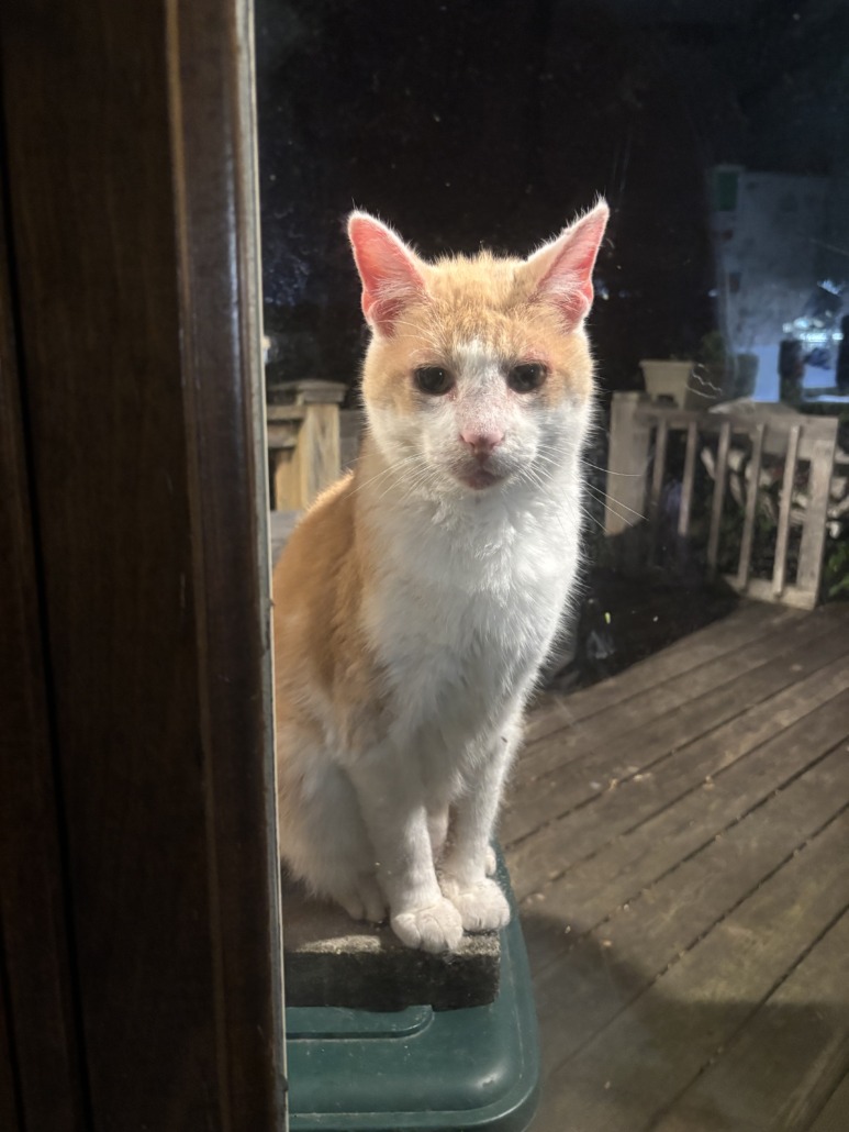 Orange and yellow male. Large boy. Currently underweight. VERY friendly and affectionate. Loves wet food. I first saw him about a month and a half ago. He would come to my back deck, where I feed some feral cats that patrol my neighborhood, but the last few days, he has not left my back deck. I am not sure if it is the weather or I am now his only place to go. The plan is as soon as I can, get flea/tick meds, get him bathed and treated and brought inside until someone claims him. Please provide proof of ownership when claiming this sweet boy.
