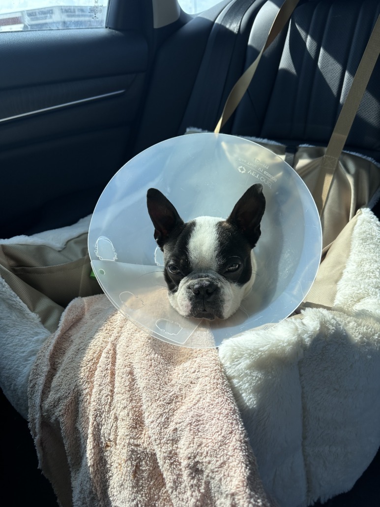 Cooper is a Boston Terrier that responds to his name. about 13 lbs. He does not have a collar, did have a cone on when lost. He also has a recent wound from surgery from neuter.