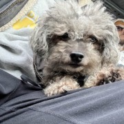 Curly hair black and gray everywhere except a little blonde over her hind end