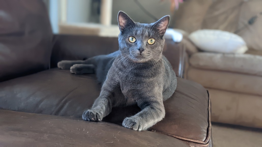 Elliott is an handsome adult male neutered gray kitty with tabby striping on his legs. He is microchipped with no collar. He is very sweet but can be skittish in new places.