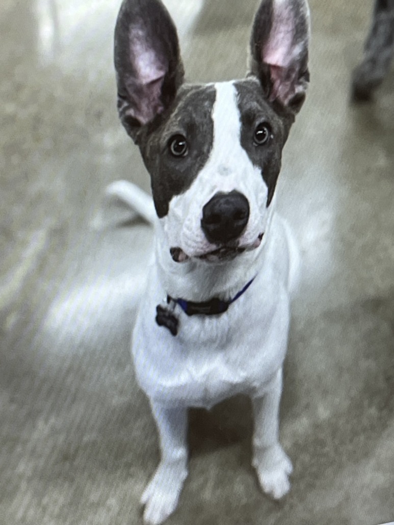Medium sized pitbull bull terrier mix. All white, grey ears, pointed ears, responds to the name Dwight