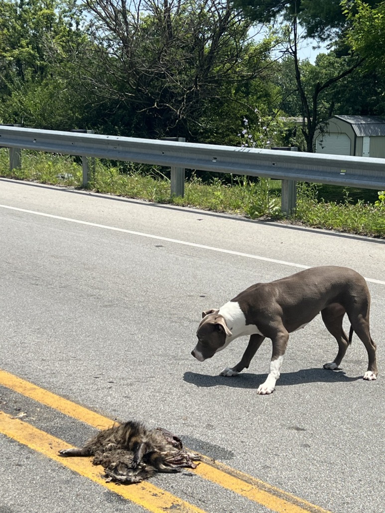 Dog with no collar. Trying to eat road kill on south west side of Indy off of W mooresville rd and Tincher Rd over the 465 bridge.