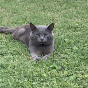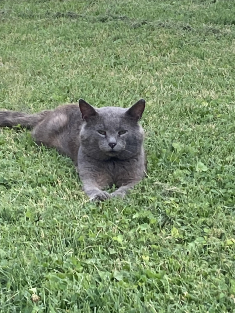 Grey male cat. Accepts food from a distance but is somewhat skittish. Green eyes. Provide proof of ownership