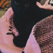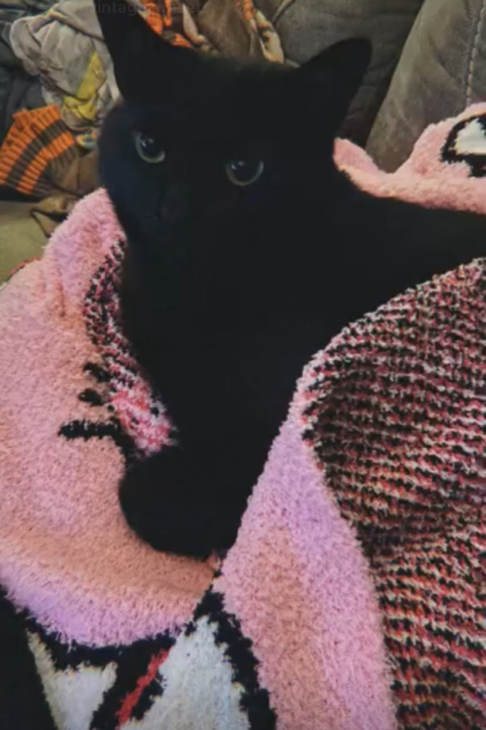 Minnie is a friendly shorthaired black cat. She will often come to her name being called. She weighs between 9 and 10 pounds and has both sets of claws.