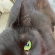 Super friendly, way too skinny black cat with green eyes, a brown undercoat, and somewhat disproportionately large paws. The cat has a green collar with a bell but no tag. This cat very clearly has been someone’s pet somewhat recently. This cat was also pregnant when first seen but seems to have delivered without any sign of kittens since. Despite having a collar, this cat is very clearly neglected and likely has fleas, given the scabbing on the backside and backs of the ears. This cat loves to roll around on the ground and flop at your feet.