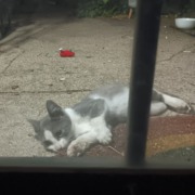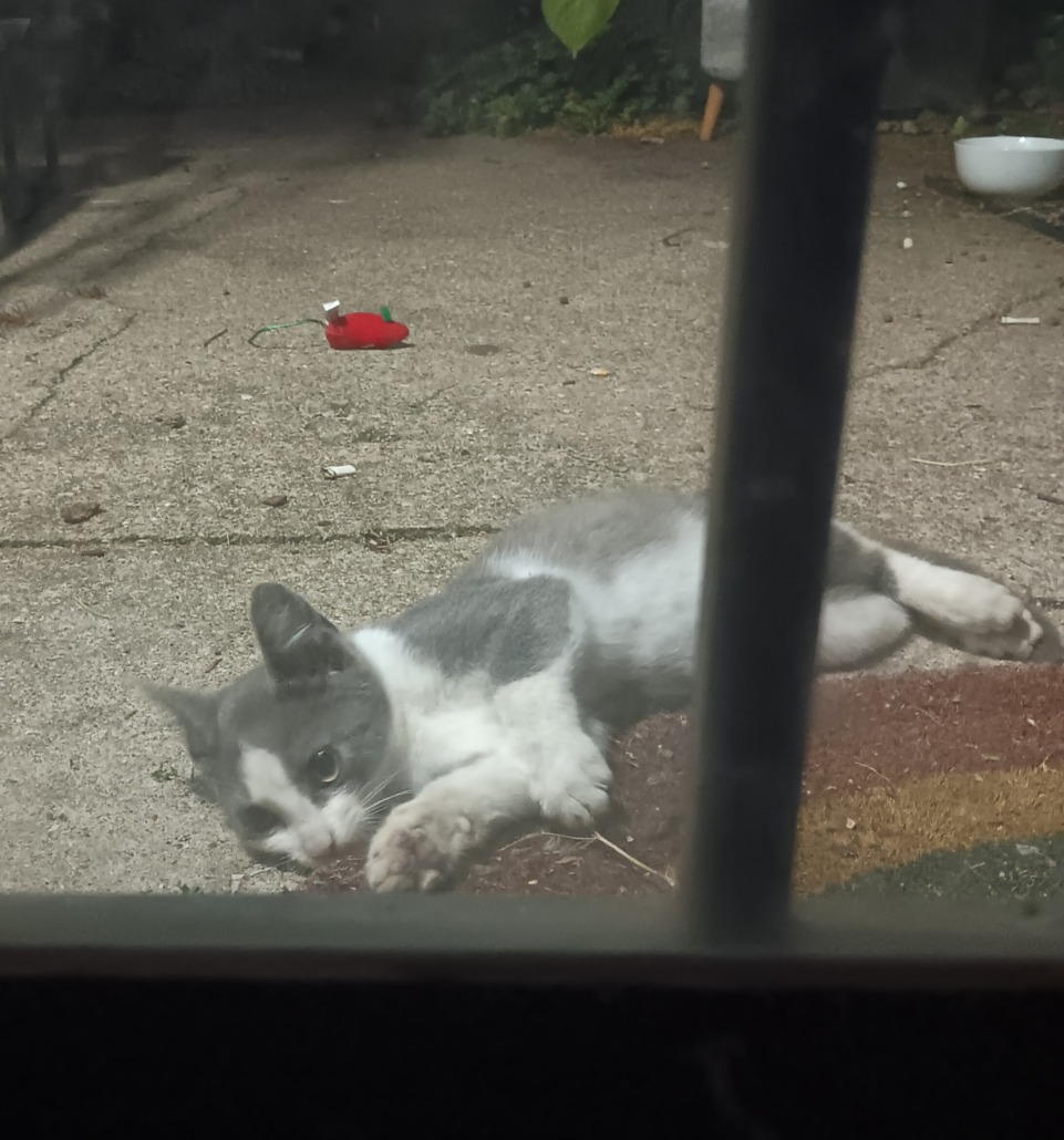 Kitten found on front porch, looks to be about 10-12 weeks old judging by size. I have not been able to capture them yet, but they are getting food and water daily. Skittish near humans but clearly comfortable around other cats, the kitten interacts with my cats through the door regularly.