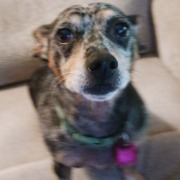 Small dog, brindle color, big ears, a little chunky, older, I think. Responds to her name.