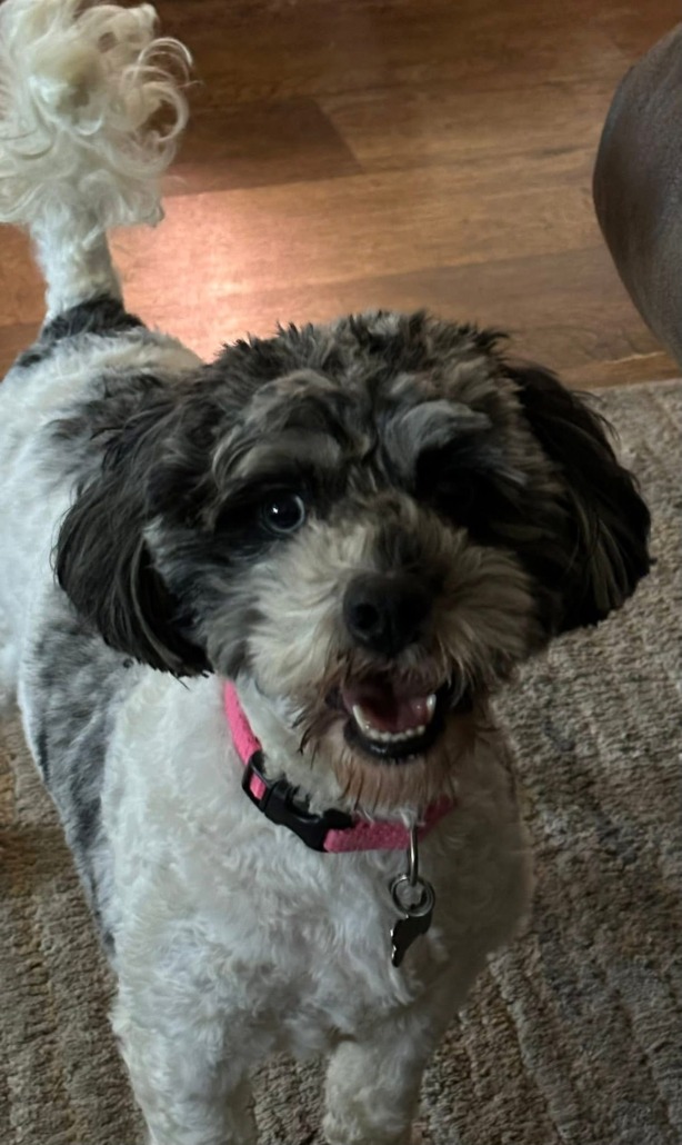 She’s a small dog about 15 pounds she’s spotted black and white and she has hetocromia in her right eye split brown a a bright blue