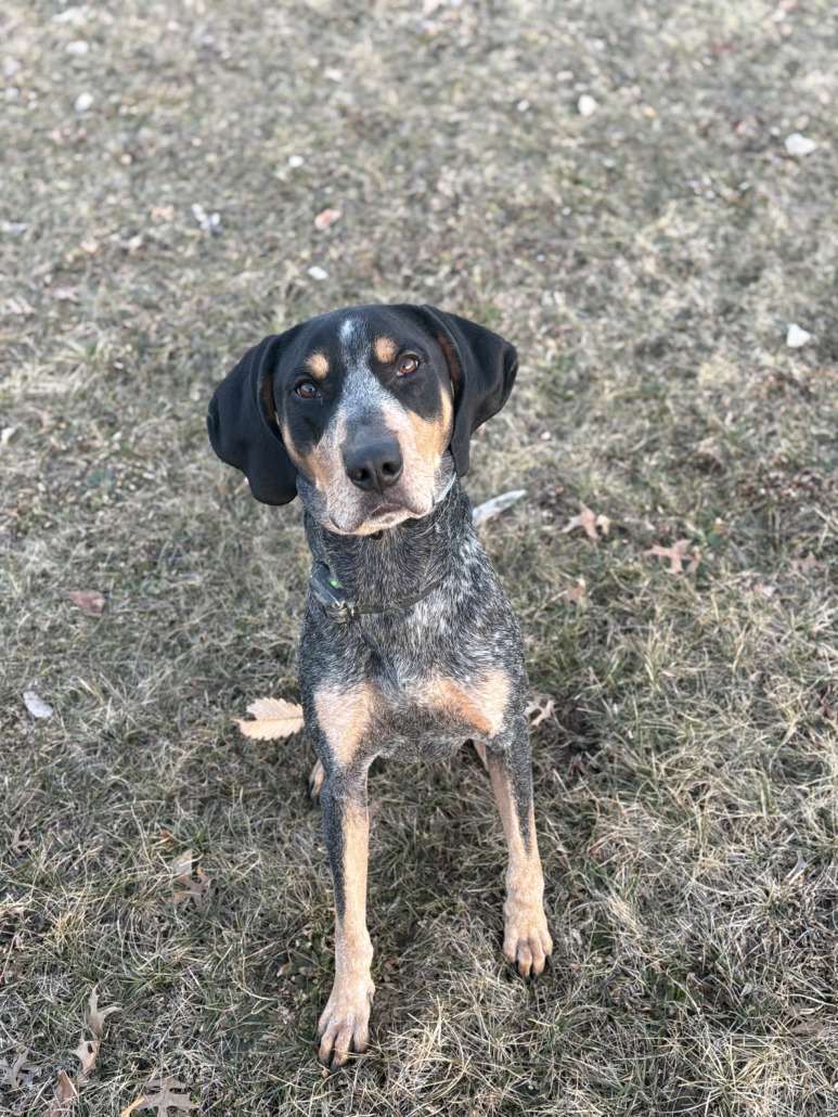 Blue tick coonhound, he has a little skin tag on the back of his front left leg, he’s very sweet just not super gentle, he has a lot of energy