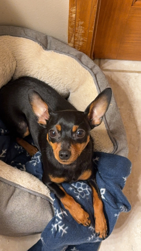 Archer is a min pin around 5 pounds