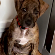He’s a 9week old puppy, very sweet & loving. Loves to give you a lot of kisses. His name is Brutus, brindle color. Had a red collar on.