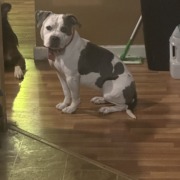She’s a white bully with greys spots on her she has hazel eyes she does respond to her name
