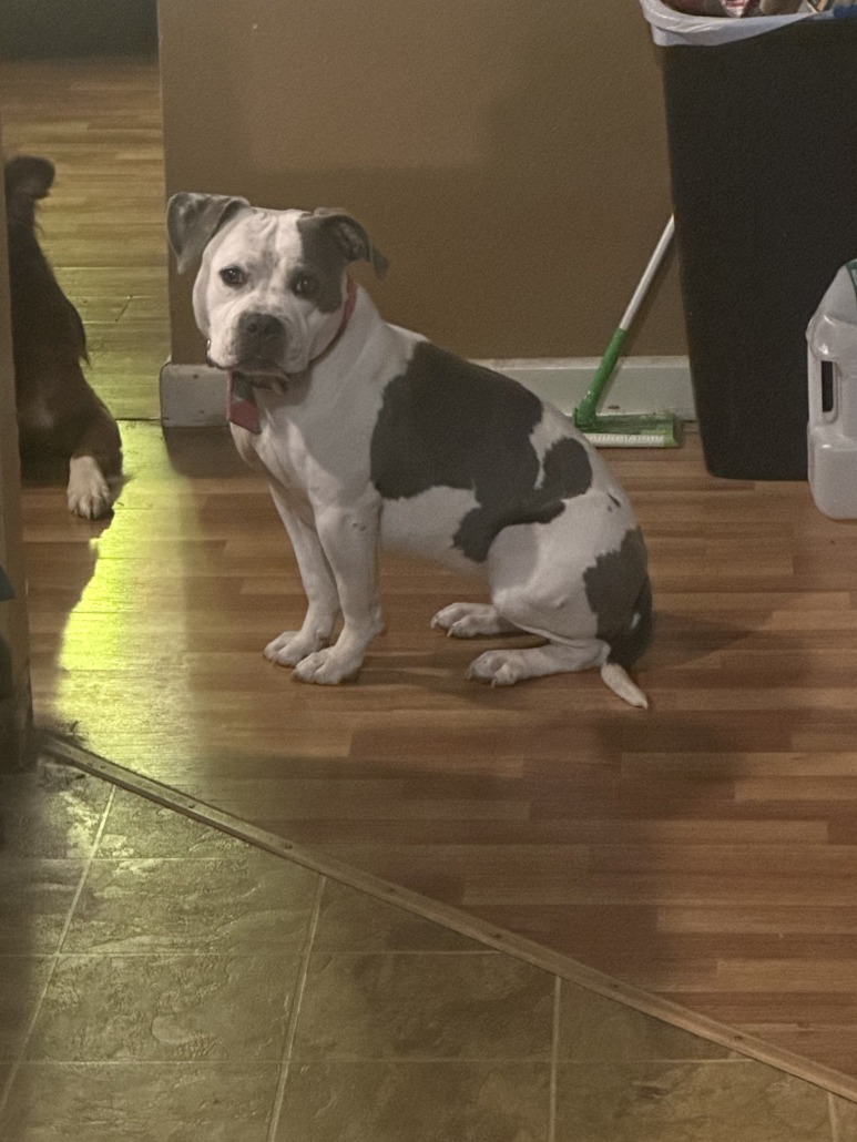 She’s a white bully with greys spots on her she has hazel eyes she does respond to her name