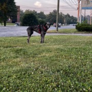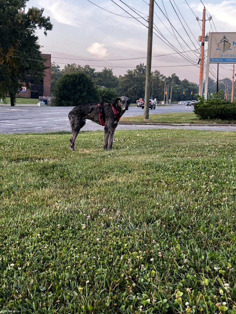 Merle, Great Dane mix? Male. Red harness and timid