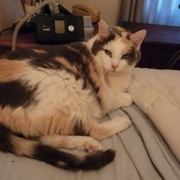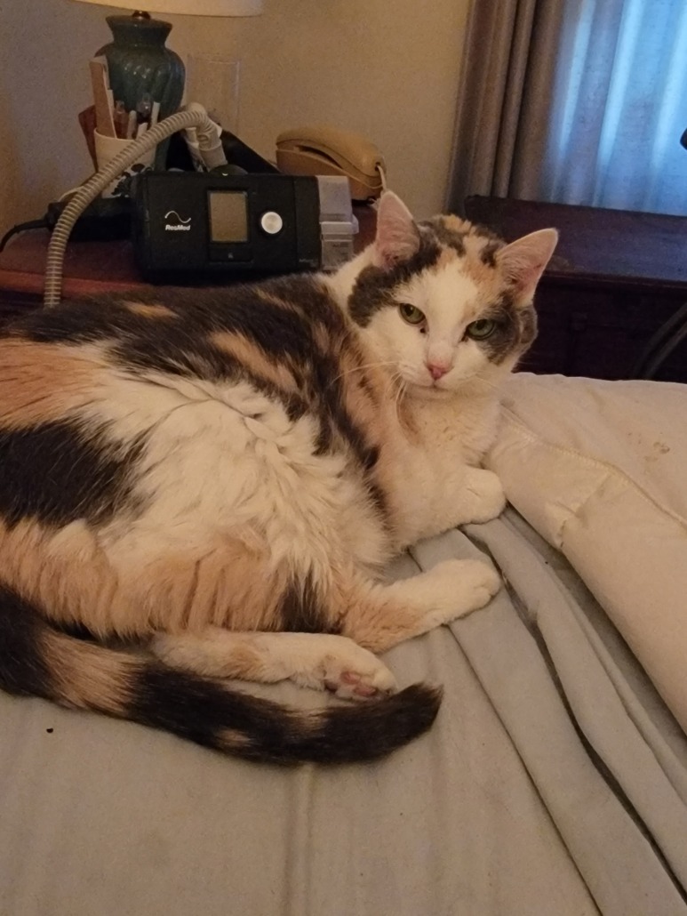 Long-ish hair, mostly white. I rescued her over 12 years ago as a tiny kitten. Inside only cat, not microchipped.