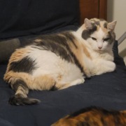 Very rotund, long-ish haired calico. Formerly feral, extremely timid, tiny voice, not very vocal. Indoor only, no collar, not microchipped.