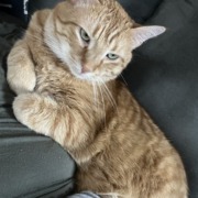 Orange tabby, he has beautiful green eyes.