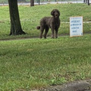 Full-grown chocolate Labradoodle running through Rhodius Park near the corner of Wyoming and Kappes. No collar. The pup looks frightened but seems friendly.