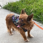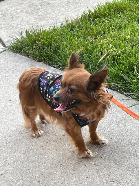 Long-haired brown Chihuahua mix in need of a grooming. Potty trained. Walks on a leash. Proof of ownership is required.