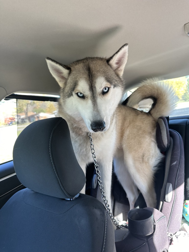 Unique Features: Very striking blue eyes, black stripe down the center of her face, curled fluffy tail